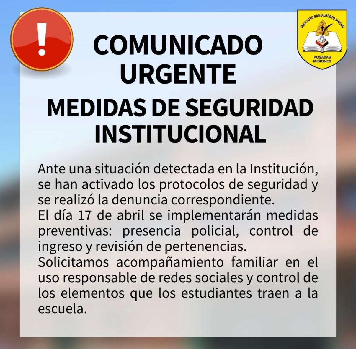 En paralelo, colegios de Posadas comenzaron a implementar medidas preventivas más estrictas para evitar situaciones de riesgo. Entre ellas, se dispuso la revisión de mochilas y pertenencias al ingreso, controles reforzados y presencia policial en las inmediaciones de los establecimientos.