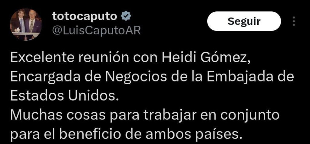 El ministro de Economía, Luis Caputo, recibió hoy a Heidi Gómez Rápalo, quien asumió interinamente como Encargada de Negocios de Estados Unidos en Argentina, cargo que ocupa hasta la llegada del nuevo embajador Peter Lamelas.