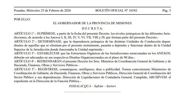 El gobernador Hugo Passalacqua firmó este miércoles el Decreto N° 267, mediante el cual el Poder Ejecutivo provincial suprimió múltiples niveles jerárquicos dentro de su estructura orgánica como parte de un plan de adecuación y modernización administrativa. La medida fue publicada en el Boletín Oficial de la provincia y abarca a la mayoría de los ministerios y secretarías del Estado misionero.