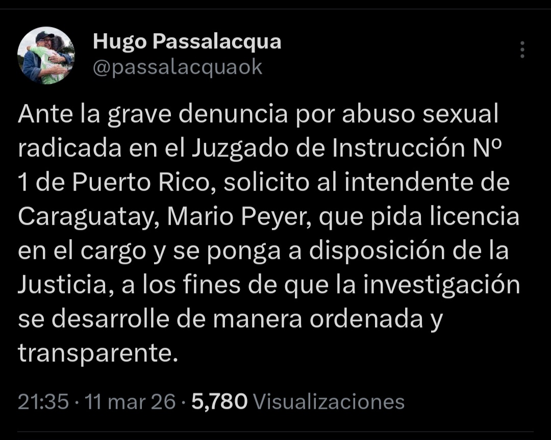 En su publicación, Passalacqua expresó: “Ante la grave denuncia por abuso sexual radicada en el Juzgado de Instrucción Nº1 de Puerto Rico, solicito al intendente de Caraguatay que pida licencia en el cargo y se ponga a disposición de la Justicia, a los fines de que la investigación se desarrolle de manera ordenada y transparente”.