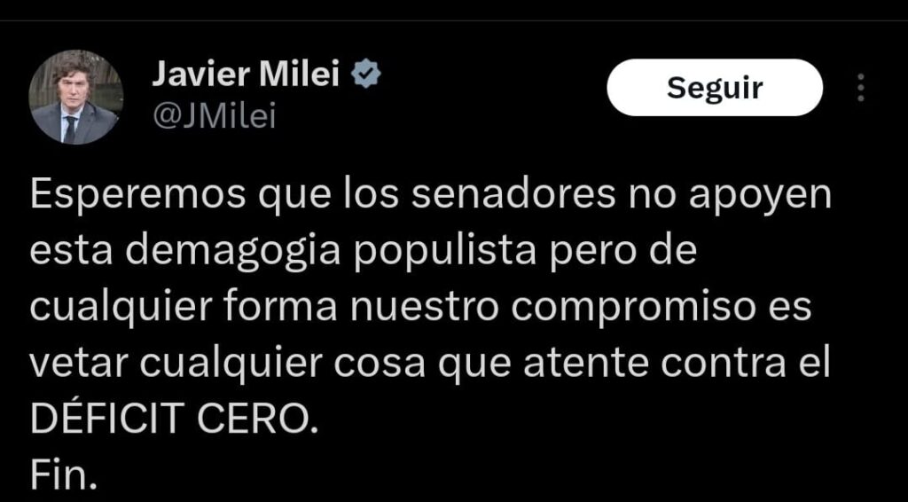 El presidente Javier Milei reaccionó rápidamente, calificando la medida como «demagogia populista» y reiterando su compromiso de vetar cualquier proyecto que comprometa el equilibrio fiscal.