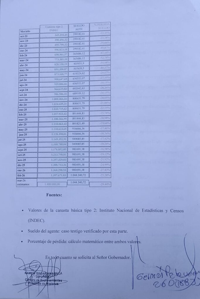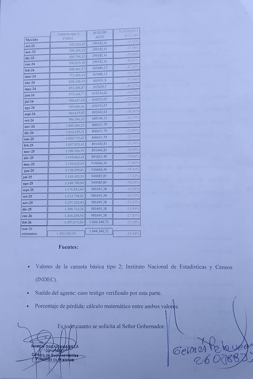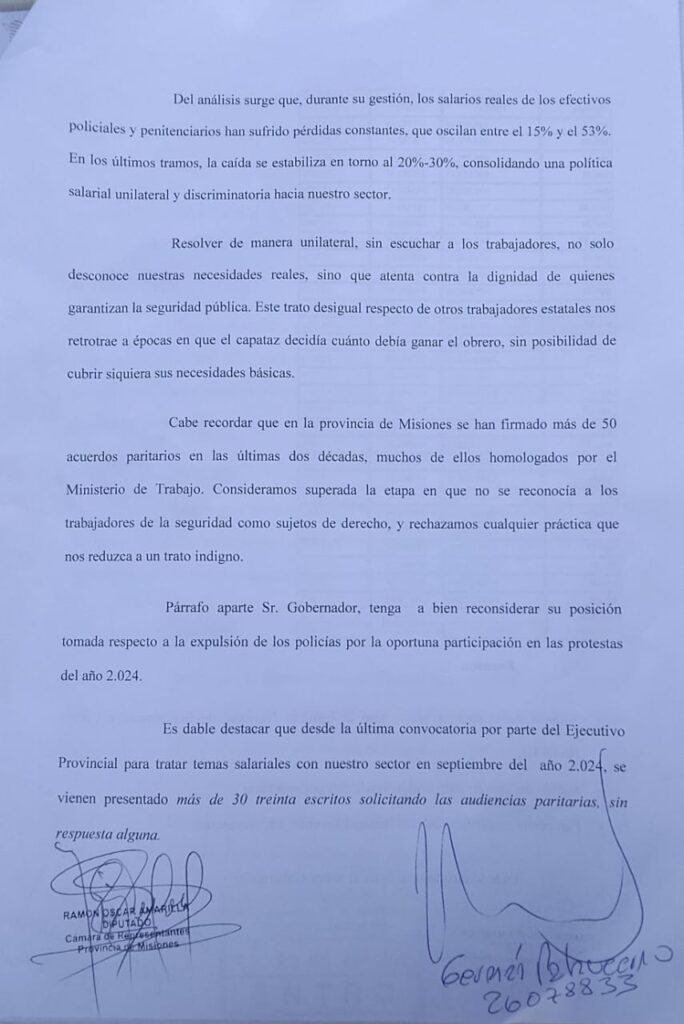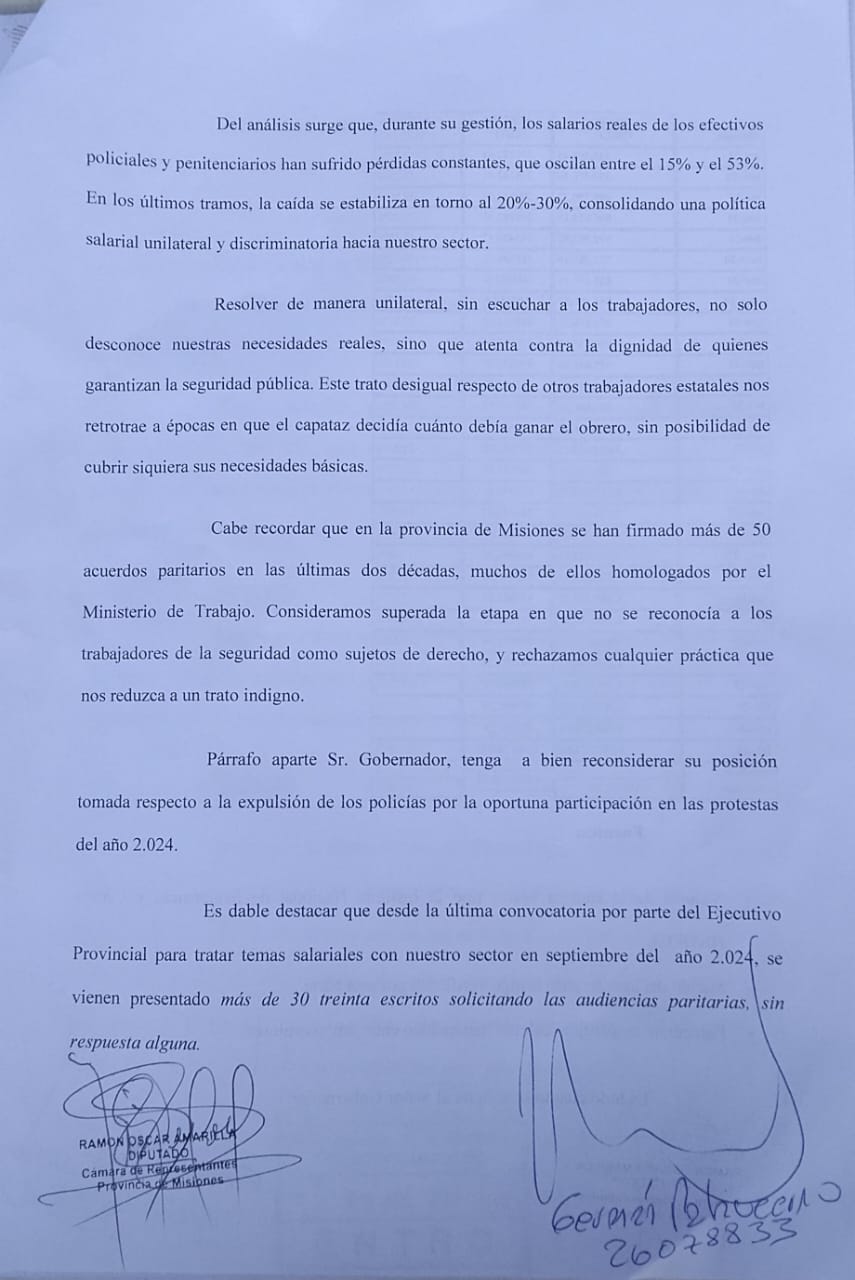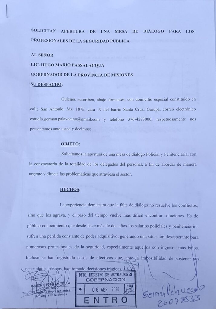 El diputado provincial Ramón Amarilla presentó el pasado 6 de abril un reclamo formal ante el Gobierno de Misiones para que se reanude la Mesa de Diálogo de la Policía y del Servicio Penitenciario, con el objetivo de discutir salarios y condiciones laborales del sector.