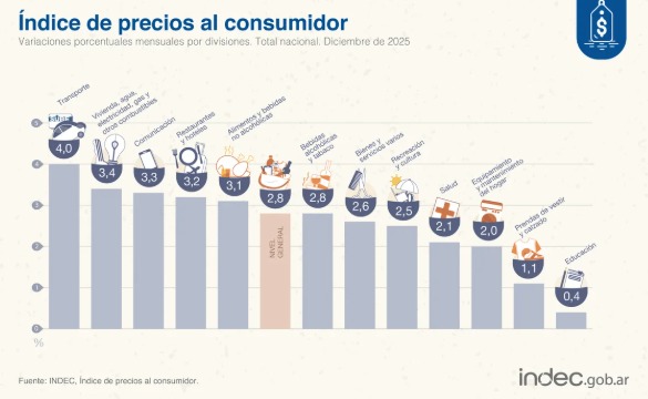 El Índice de Precios al Consumidor (IPC) registró en diciembre una variación de 2,8%, levemente por encima del 2,5% de noviembre, influido por factores estacionales de fin de año y la continuidad en la recomposición de precios relativos en sectores clave como energía, transporte y servicios regulados. Según el informe oficial del INDEC difundido este martes, la división de mayor aumento mensual fue Transporte (4,0%), seguida por Vivienda, agua, electricidad, gas y otros combustibles (3,4%). La mayor incidencia en la variación regional correspondió a Alimentos y bebidas no alcohólicas.