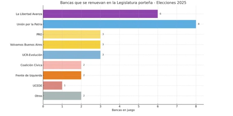 - LLA (La Libertad Avanza) pone en juego 6 de sus 8 bancas. Manuel Adorni encabeza la lista, seguido por Solana Pelayo, Nicolás Pakgojz, Andrea Freguia, Juan Pablo Arenaza, Lucía Montenegro, Leonardo Seifert y Rebeca Fleitas.