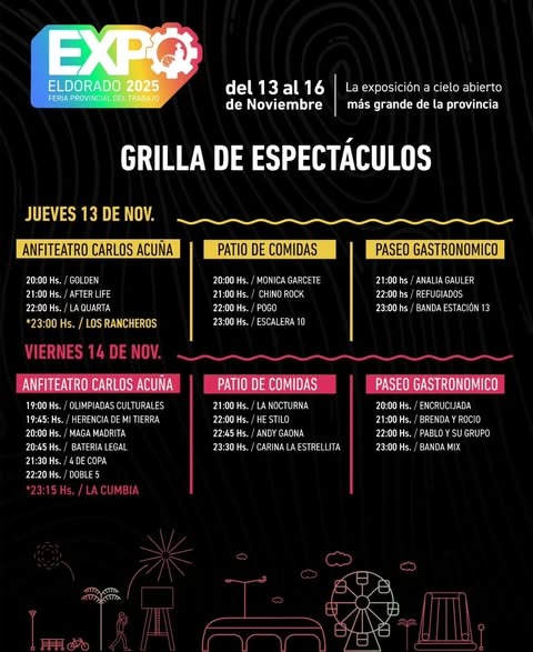 El cronograma artístico incluirá a más de 60 artistas locales y regionales, con la participación estelar de Los Rancheros, que se presentarán el jueves 13 de noviembre. La Expo Eldorado combina exposición de emprendimientos, capacitación laboral, stands institucionales y espectáculos, reafirmando su objetivo de ser un espacio de encuentro entre el sector productivo y la comunidad.