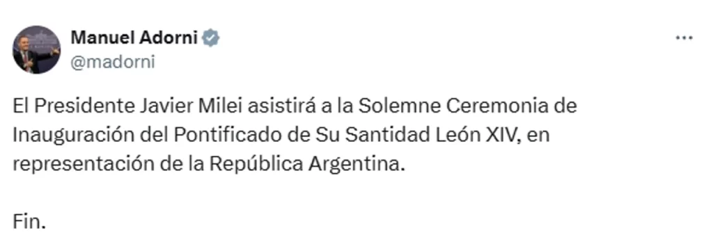 «El Presidente Javier Milei asistirá a la Solemne Ceremonia de Inauguración del Pontificado de Su Santidad León XIV, en representación de la República Argentina. Fin», indicó el vocero presidencial y candidato a legislador porteño, Manuel Adorni, en su cuenta de la red social X.