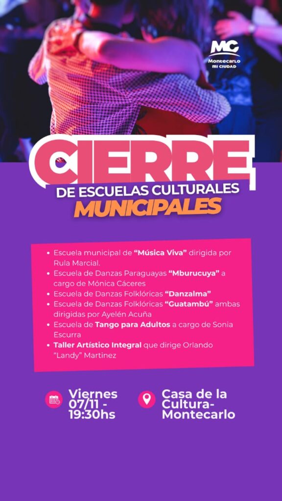En diálogo con Portal Misiones, Claudia Torgen, a cargo de la coordinación del evento, confirmó que este viernes 7 de noviembre a las 19:30 horas se realizará el cierre de las Escuelas Culturales Municipales en la Casa de la Cultura de Montecarlo, siempre y cuando el clima acompañe. En caso de lluvia, la actividad se reprogramará para el 21 de noviembre.