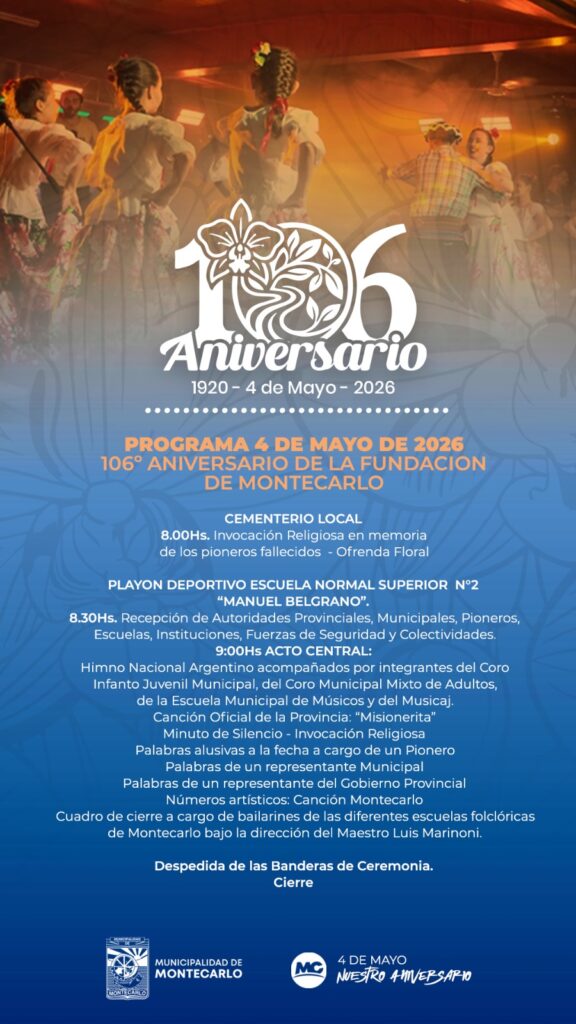 El acto central tendrá lugar el 4 de mayo a partir de las 9 en el playón deportivo de la Escuela Normal, espacio que fue elegido para garantizar comodidad y que se utilizará independientemente de las condiciones climáticas. La ceremonia contará con el acto protocolar, la participación de un coro principal y un cierre artístico a cargo del director de ballet del Luis Marinoni, con una puesta de nueve minutos que incluirá a más de diez escuelas folcloricas de Montecarlo.