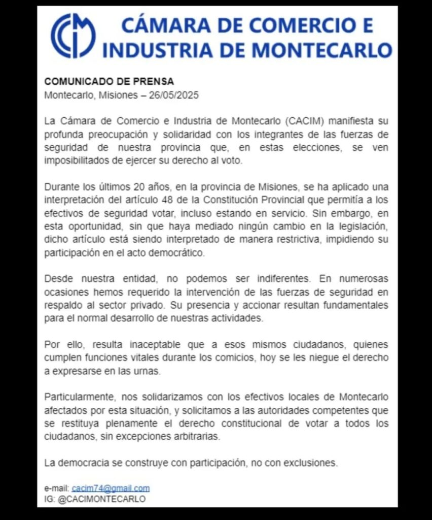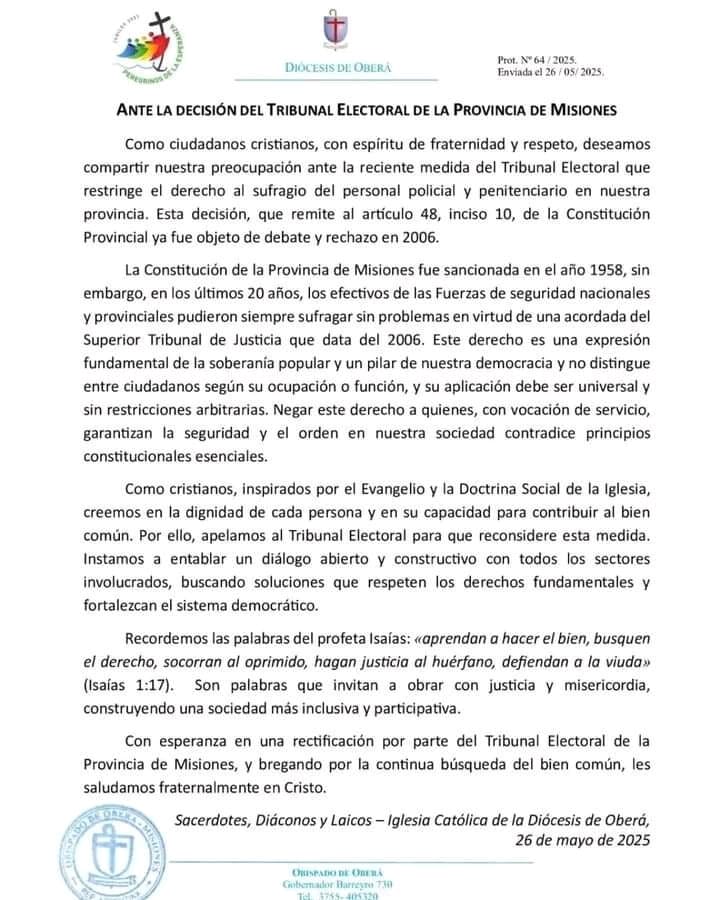 La Diócesis de Oberá y la Cámara de Comercio e Industria de Montecarlo (CACIM) expresaron su preocupación y rechazo ante la resolución del Tribunal Electoral de la provincia de Misiones, que excluye del padrón electoral a todo el personal activo de las fuerzas de seguridad, impidiéndoles votar en las elecciones legislativas del 8 de junio.